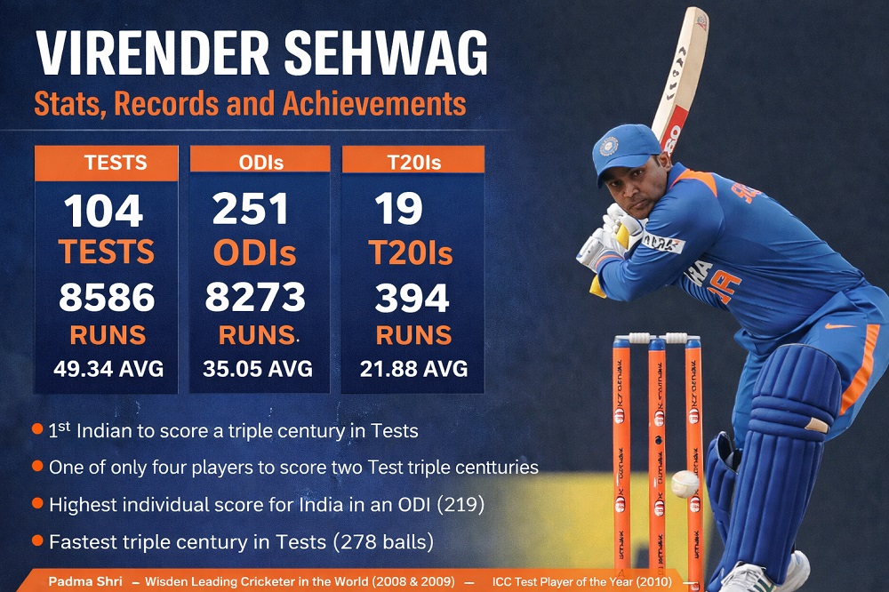Sehwag’s stats, records, and awards reflect a career built on innovation, power, and consistency. His legacy remains a benchmark for aspiring cricketers worldwide, ensuring that his name will always shine brightly in cricket history.